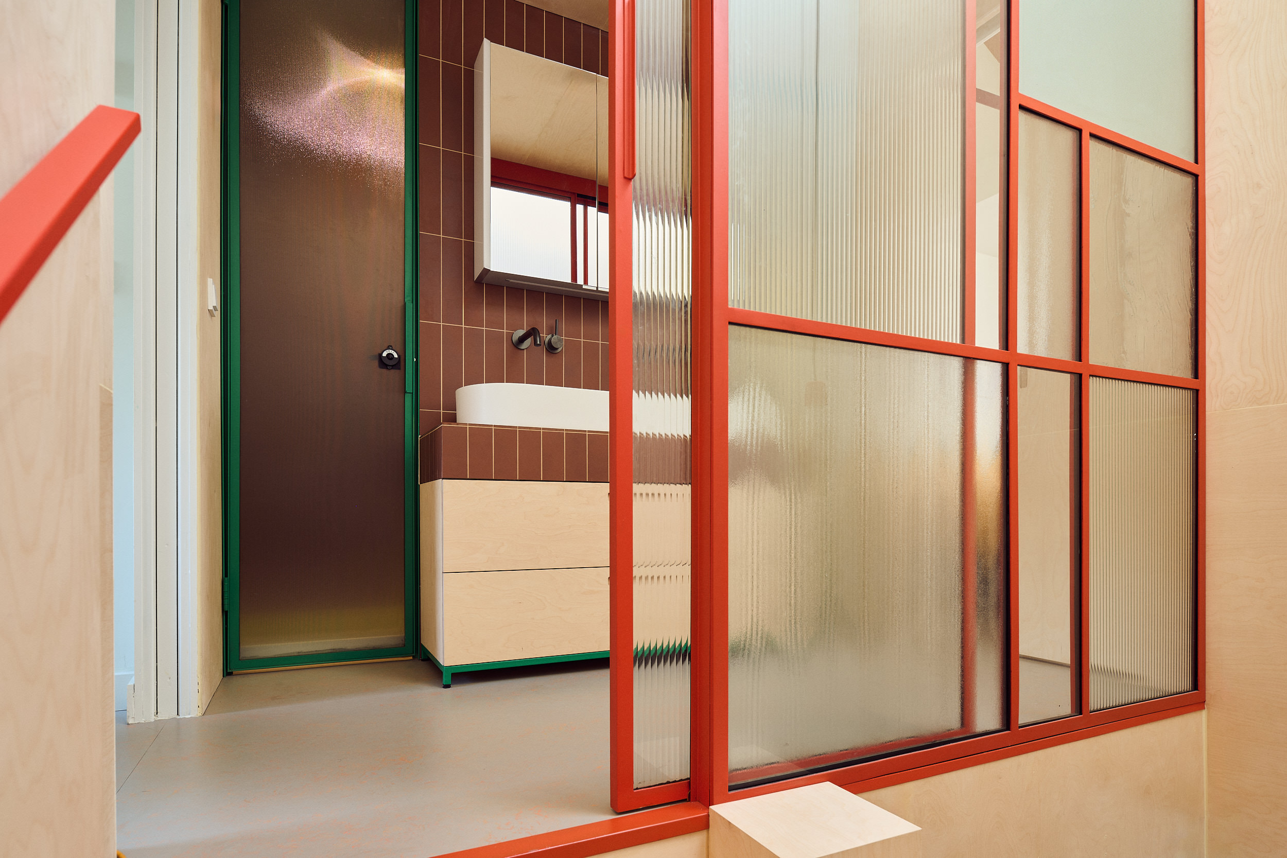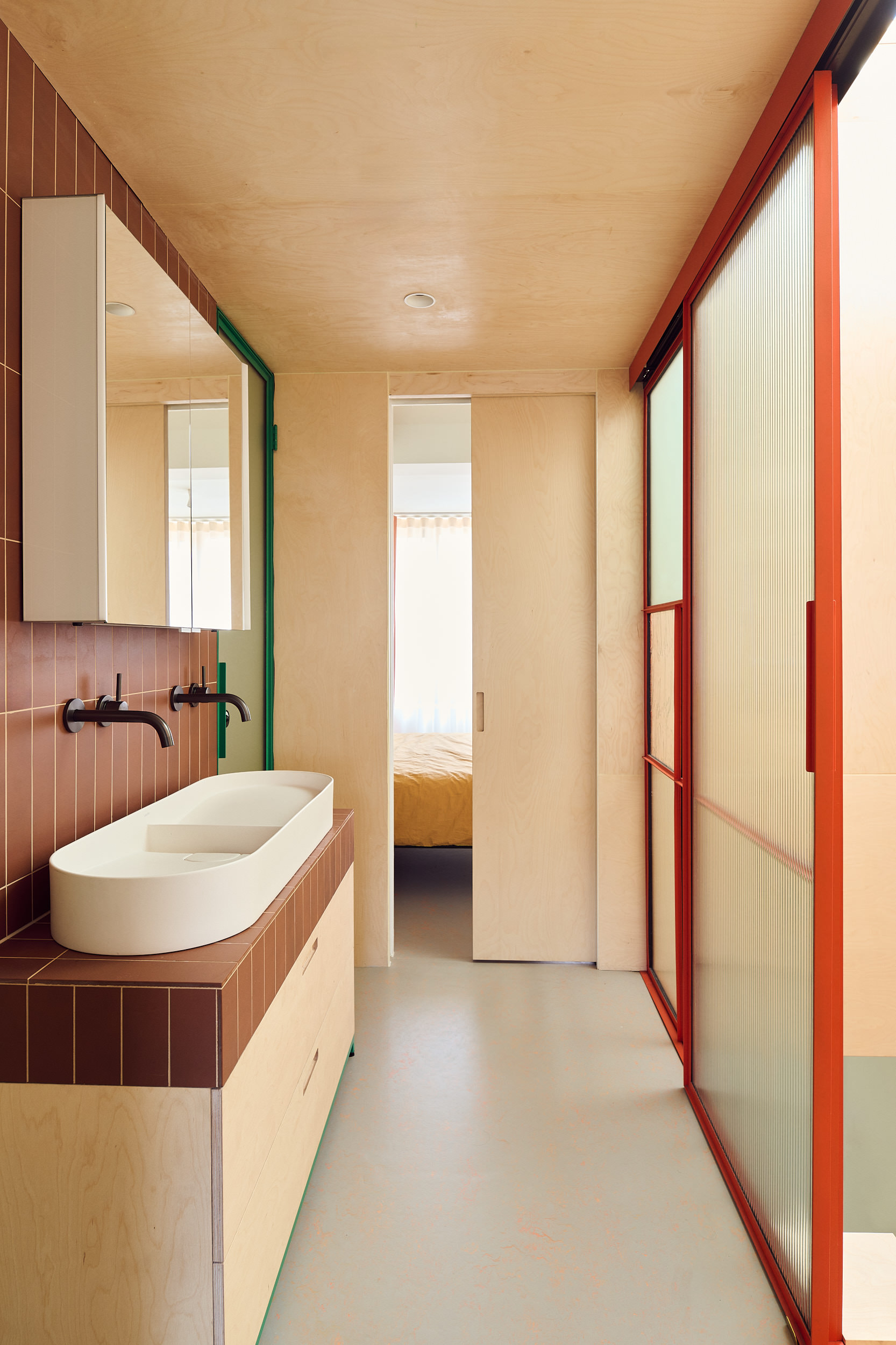 De bovenverdieping is slim verdeeld door een natte ruimte omsloten door geribbeld glas binnen stalen frames, wat een balans biedt tussen moderniteit en respect voor het industriële verleden. Hier biedt de dubbele wastafel Sonar, ontworpen door Patricia Urquiola voor LAUFEN, voldoende ruimte voor bad rituelen.