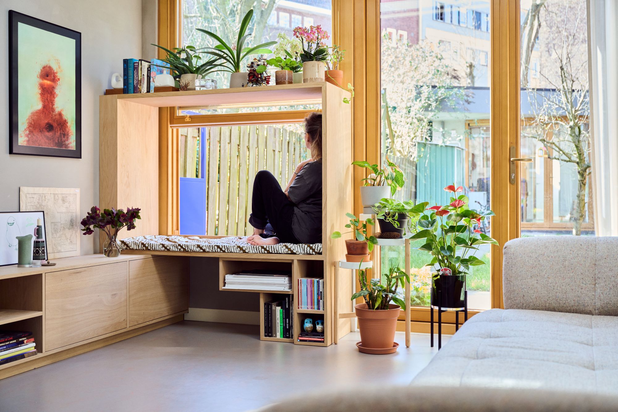Door nauwe samenwerking met de klanten, die een gedurfde en fantasierijke ontwerpvisie omarmden, werden waar mogelijk natuurlijke materialen gekozen, waarbij berken multiplex - een favoriet van de opdrachtgever - centraal stond. Dit veelzijdige materiaal vormt een centrale ontwerptaal, verwerkt in belangrijke elementen zoals de trap, toilet en open kastruimte. In contrast hiermee staan op maat ontworpen elementen, waaronder de keuken, tv-meubel en een gezellige zithoek, die doorloopt in een groot raam dat een directe verbinding biedt met de tuin.